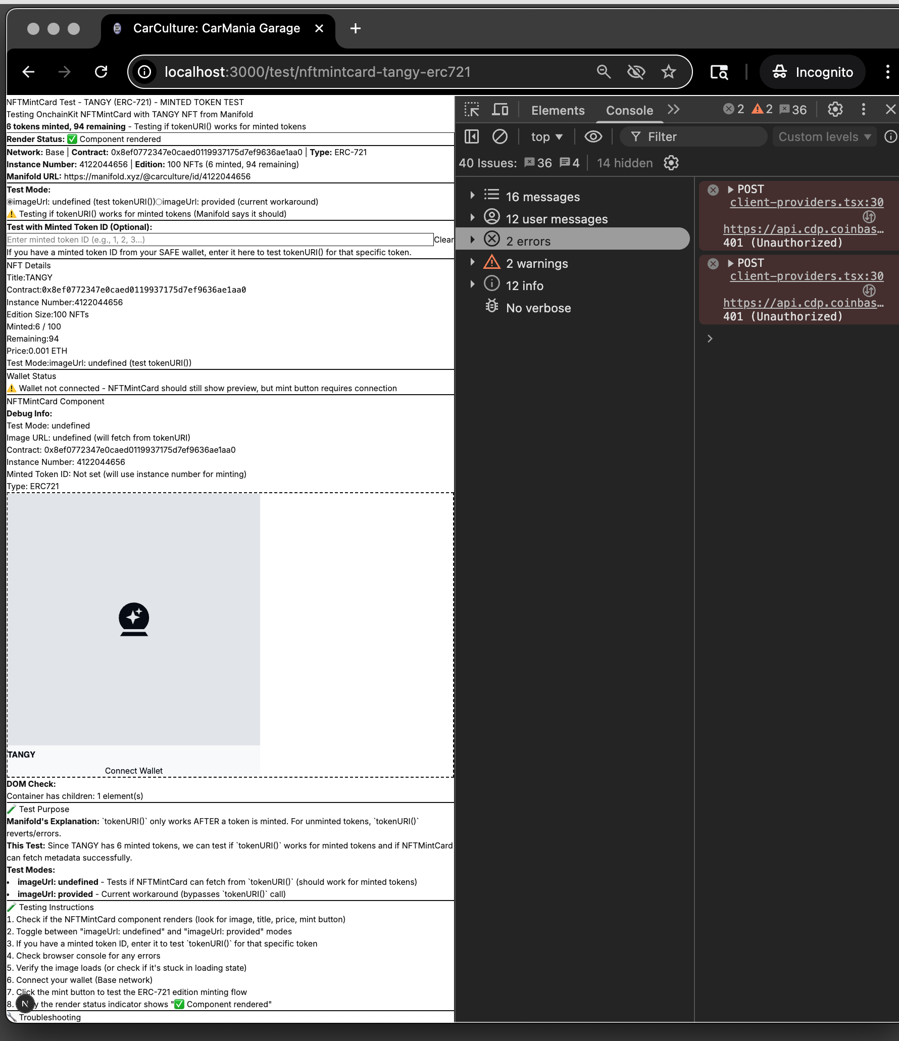 The NFTMintCard component renders but the image does not load from the contract metadata. When we set imageUrl: undefined (to let the component fetch from the token), the image remains in a “loading” state and never displays.