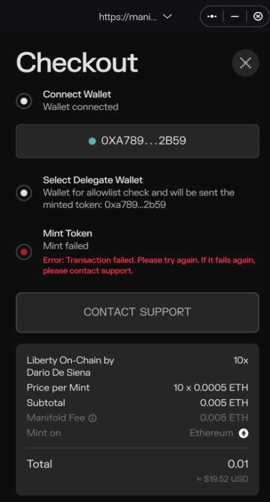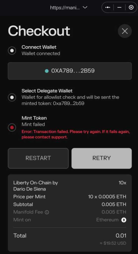 We checked your wallet — you’re just barely short on ETH to cover the mint cost plus gas fees for 10 mints. You’ll need about 0.0124 ETH total and your balance is right at that line. A bit more ETH should do it!