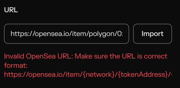Hi! I’m trying to import from OpenSea to show nft on profile page. The url is in the correct format but shows an error.