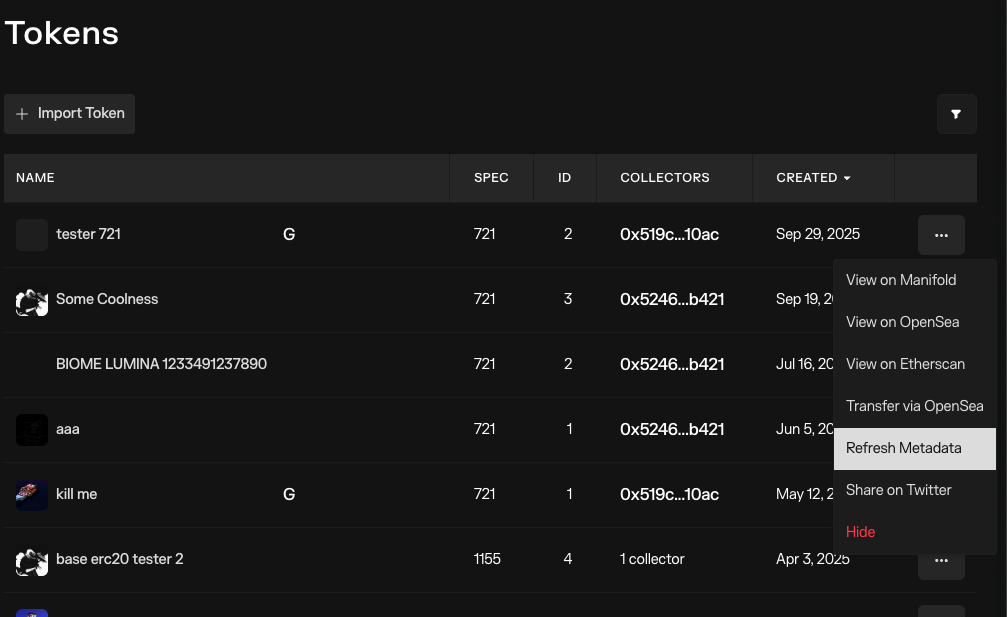 gm team. Last night I updated/re-minted a token in mainnet via the html file in efficax, I see the changes reflected in OS but not in Manifold. Is there a “refresh” button somewhere there? Or could you guys help me with a refresh? I may need to refresh 2 more times. Can I do this on my own? Thx for all your help!