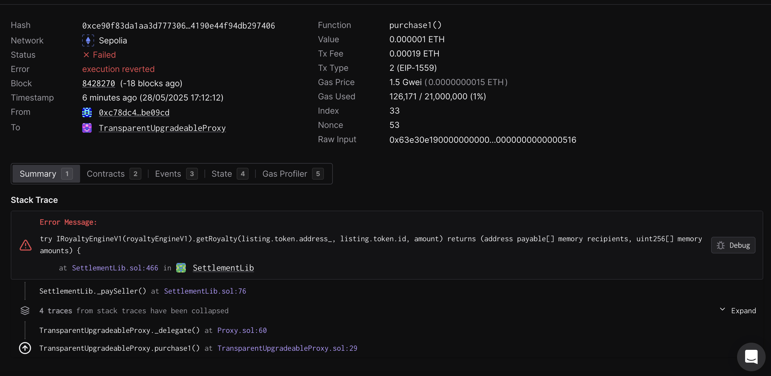 Ah OK I think the issue is maybe the royaltyEngineV1 is 0x0000000000000000000000000000000000000000…?